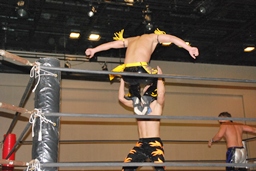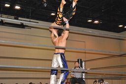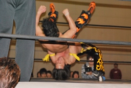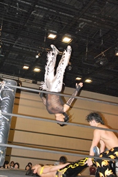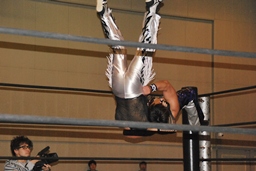 MIKAMIコーナーに上る、HARASHIMAも上り雪崩式ブレーンバスター(右写真)からファルコンアロー、カウント2。