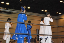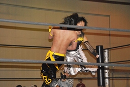 KUDOが距離を詰める、MIKAMIかわす。KUDOローキック、ミドルキック、ニーリフト(左写真)、ヘッドロック。MIKAMIロープに振る、KUDOショルダーブロック。