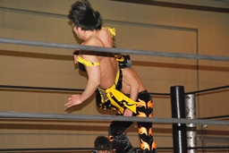 コーナーに振る、MIKAMI入って串刺しニーアタック、高梨も串刺しニーアタック。MIKAMIコーナーに上ってスワントーンボム(右写真)、高梨ジャックナイフ、カウント2。10分経過。