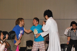 第4試合終了後に純烈ミニライヴ。「星降る街角」を歌いながら客席を回る純烈メンバー。握手してもらって喜ぶ男色と大石(右写真)。