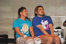 そこに高木三四郎。「GM、お前が何決定してんだよ?確かに今日の清水大会は前回の1.5倍のお客さんが集まった。両国初日、純烈、出しません!まだまだ俺たちDDTのフィールドに溶け込んでねーんだよ!紙テープの量が足りねーんだよ!もっともっとDDTのフィールドに溶け込まねーと大勢のお客さんを満足させられねーんだよ!俺達は5/29に工場プロレスをやる!お前らそこにジョイントする勇気はあるか?」