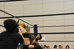 コーナーからダイビングクロスボディ(右写真)、カウント2。