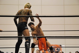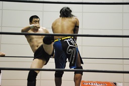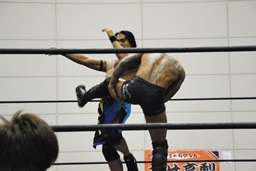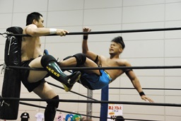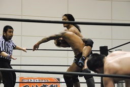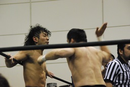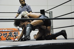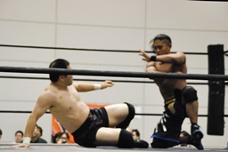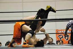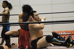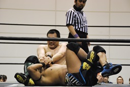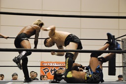 彰人レッグロック、佐藤十字に切り返す(右写真)、彰人足取って高梨にタッチ。