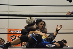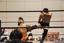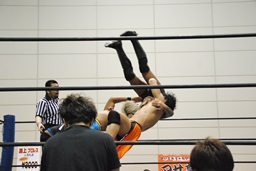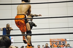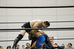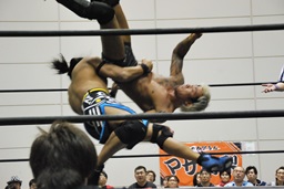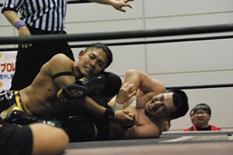 彰人飛行機投げ固め(右写真)、カウント2。