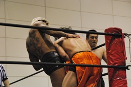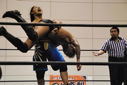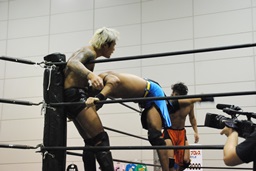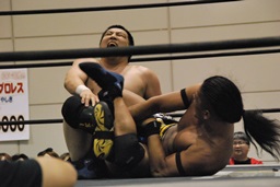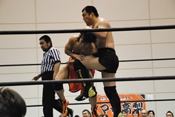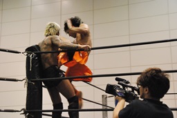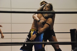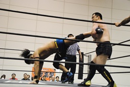 高梨パンチ、ガットショット連打。首投げからスリーパー(左写真)。バックドロップ狙う、佐藤ロープに逃れる。