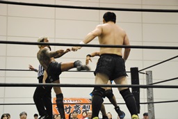 坂口ヒザ蹴り3連打(左写真)、ミドルキック、ローキック、カウント2。ヒザ蹴り、ミドルキック、佐藤にタッチ。