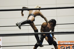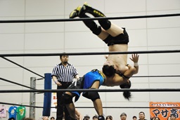 佐藤エルボースタッブ、高梨スクールボーイ(右写真)、カウント2。彰人にタッチ。