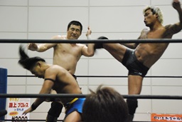 彰人2人にボディスラム連発。佐藤と坂口は交互にミドルキック(左写真)。