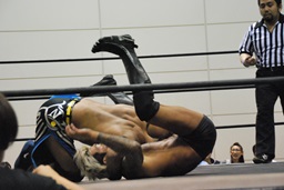 彰人さらに切り返して変形足4の字固めに(右写真)、佐藤ロープ。
