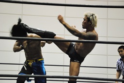 彰人ロープに飛ぶ、坂口ハイキック(左写真)。
