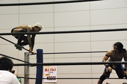 坂口エプロンからトップロープに飛び乗って(右写真)、