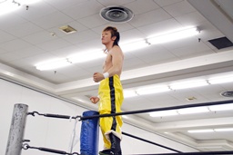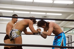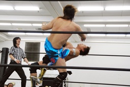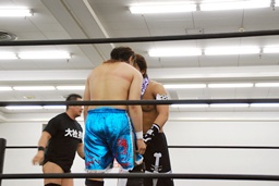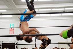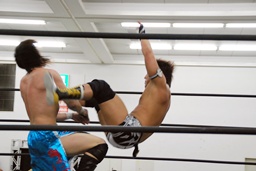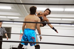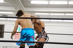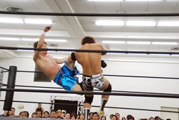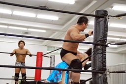 剣心ミドルキック(左写真)。平田コーナーに連れ帰り高木とタッチ。