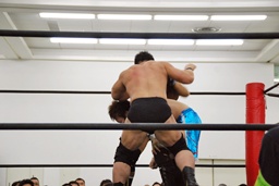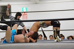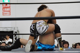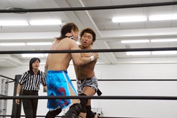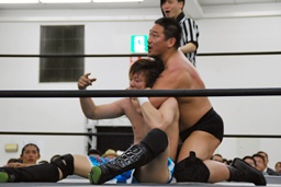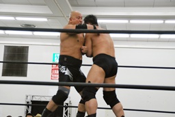 エルボーの打ち合いから剣心ノーザンライトスープレックスホールド(左写真)、カウント2。