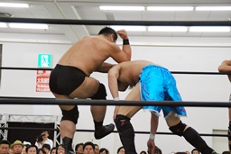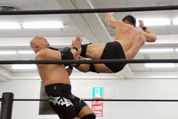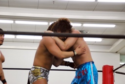 高木クローズライン、相島かわしてショルダーブロックで倒す(右写真)。