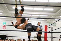 高木も首投げからスリーパー(右写真)、剣心ロープ。高木は平田にタッチ。