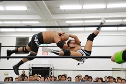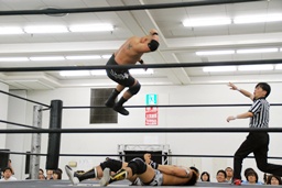 高木ボディスラムからストンピング、ロープに固定してヒップドロップ(左写真)、カバー、カウント2。平田にタッチ。