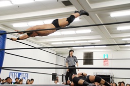 相島コーナーに上ってダイビングエルボードロップ(右写真)、カウント2。