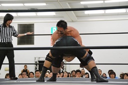 高木腕をひねる、相島切り返す(右写真)。ハンマーロックからヘッドロックに。