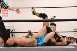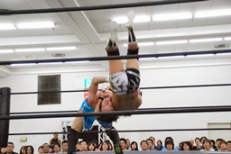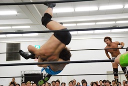 平田ミサイルキック、ロープに飛んでスライディングキック(右写真)、カウント2。
