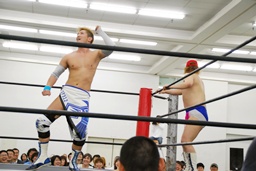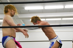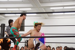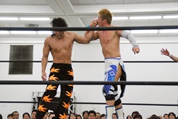高梨トラースキック、大石キャッチ、高梨大石の鼻をつまんで(左写真)チョップ。