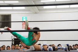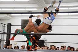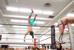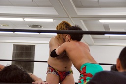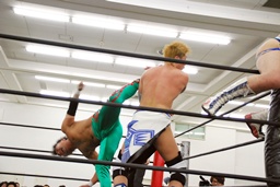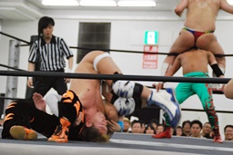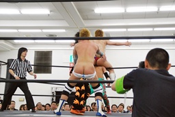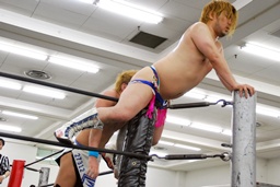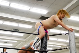 ディーノがロープ上でパロマに男色三角絞め、大石が高梨にスタナー(右写真)、