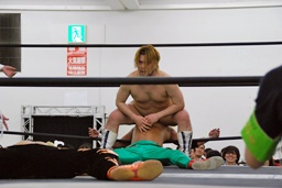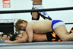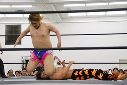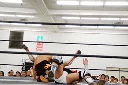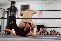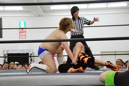 パロマがパンチ、ディーノは高梨の顔面に座り込む(左写真)、カウント2。