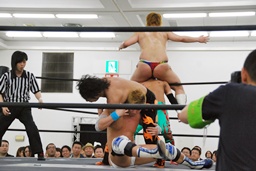 エルボードロップ(左写真)。高梨にタッチ。大石もディーノにタッチ。