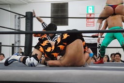 大石が入り高梨をカニばさみで倒すとディーノが男色三角絞め(左写真)。