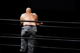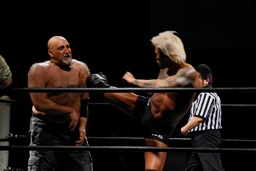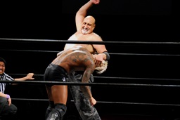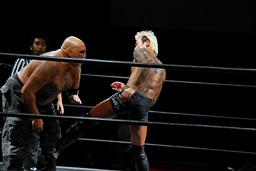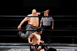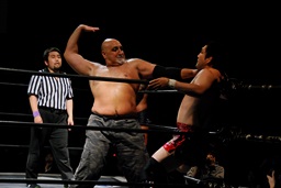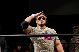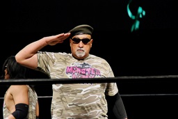 イマチ大佐入場(左写真)。今日はいつでもどこでも挑戦権をめぐるシングル2つとタッグタイトル戦か。モンスター・アーミー・デーだな。