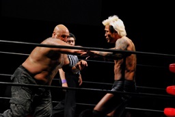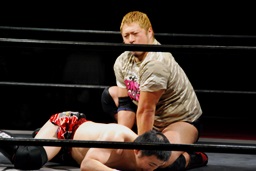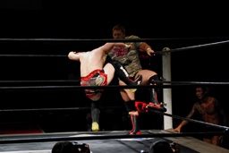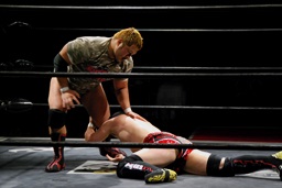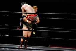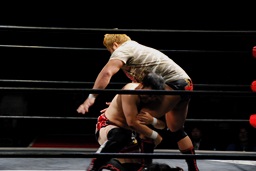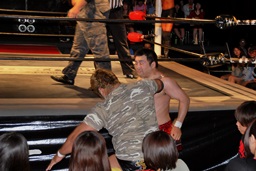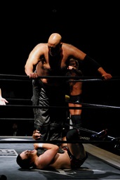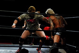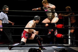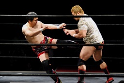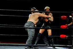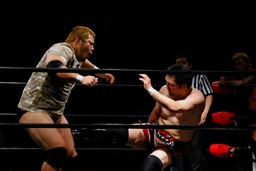 火野チョップ(左写真)、坂口掌底の打ち合い。火野ネックロック、坂口コーナーに押し込んで佐藤にタッチ。5分経過。
