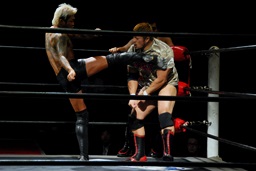 星誕期逆水平、コーナーに振って突っ込む、佐藤かわしてジャンピングハイキック(左写真)、坂口にタッチ。
