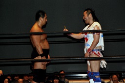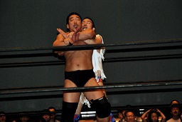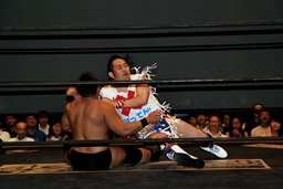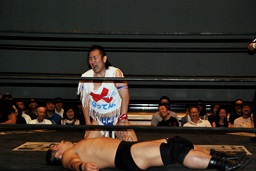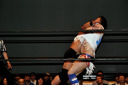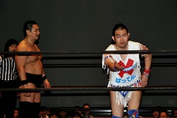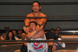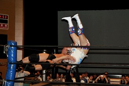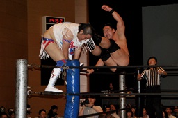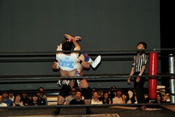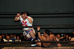 ばってんコーナーに上る、高木ドロップキック(右写真)。