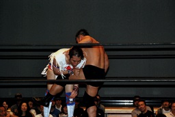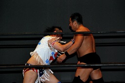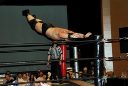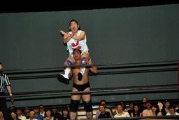 新技ばってんスープレックス狙う(右写真)、しかし「バランス悪い!」上げることできず。