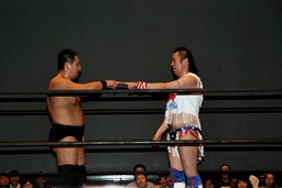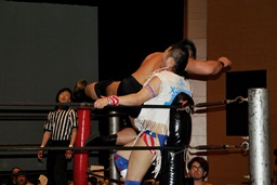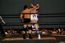 左右のばってんボンバーからもう一発ばってんボンバー(右写真)、カウント2。10分経過。