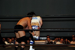 ばってん高木をリングに戻すとコーナーに振る、高木切り返して串刺しエルボー(右写真)、
