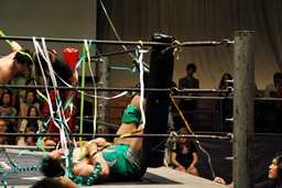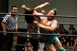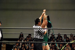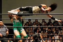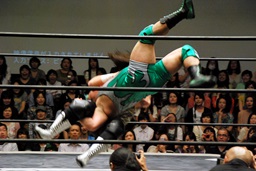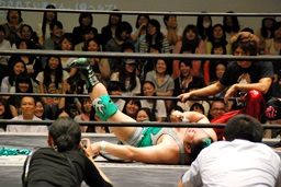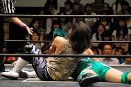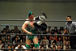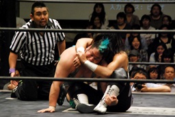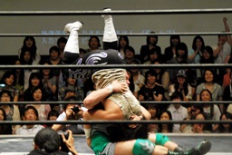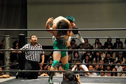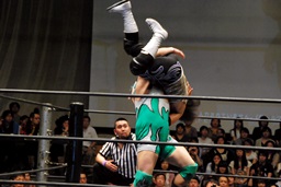 佐々木コーナーからダイブ、入江キャッチしてパワースラム(右写真)、カウント2。さっきの石井戦もそうだが、ピンチを一気に挽回できるのはこの使い続けてどんな体勢でも出せるようになったパワースラムだよな。