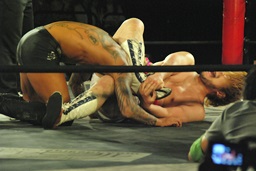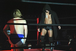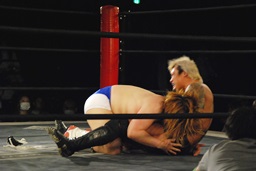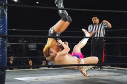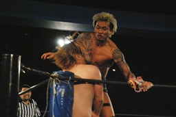ディーノ男色三角絞め(右写真)、坂口ロープ。