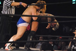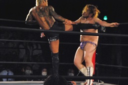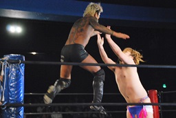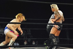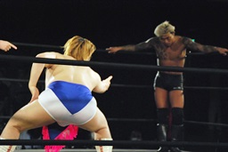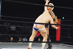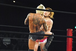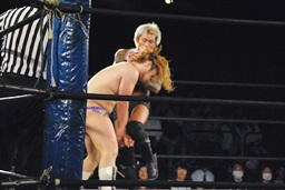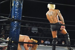 坂口エプロンに出てスワンダイブパンチ、ディーノキャッチ(右写真)、
