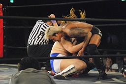 坂口バックに回ると変形胴締めスリーパー(左写真)、ディーノギブアップ。