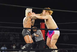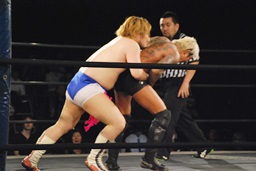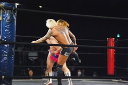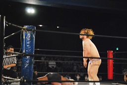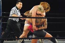 坂口キック連打でロープに詰める、レフェリーがブレーク(左写真)。