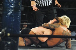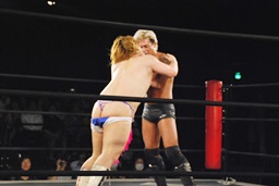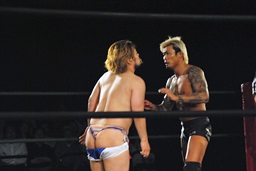 ディーノは坂口をロープに詰めるとタイツに手を突っ込み(右写真)、