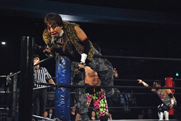 伊橋がコーナーに上る、マイケルが足を抑え、遠藤が尻にドロップキック(左写真)、伊橋場外転落。オーバー・ザ・トップロープで失格。