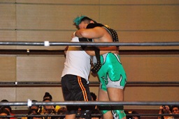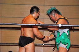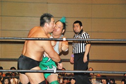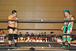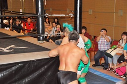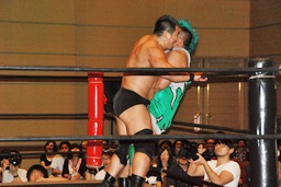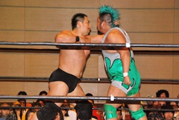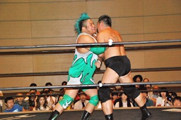 ロックアップ、高木がロープに押し込む、ブレーク。再度ロックアップ、高木ヘッドロック、入江ロープに振る、ショルダーブロックの打ち合い(左写真)。