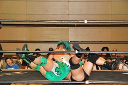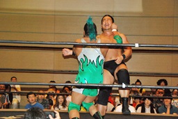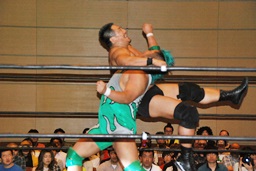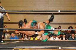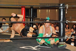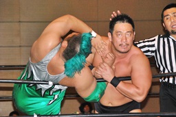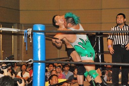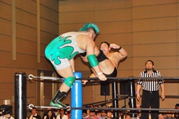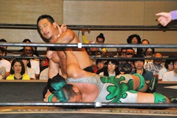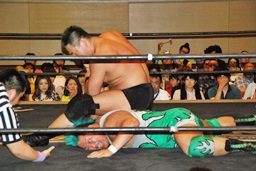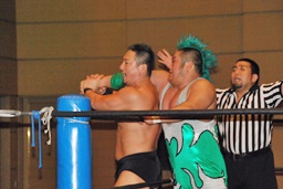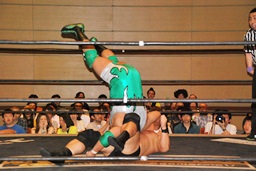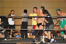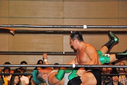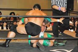 入江コーナーに上る、高木ドロップキックでエプロンに落としてぶっこ抜き雪崩式ダブルアームスープレックス(左写真)、カウント2。