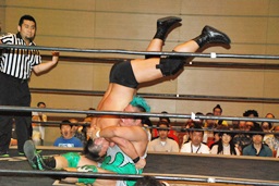 入江はエルボー打ち込んで自分が垂直落下式バックフリップ(左写真)、カウント3。