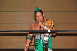 入江「自分には高木さんには感謝しかないです。ありがとうございました。高木さんが言ったように、両国に行くには7月21日、あの化け物の岡林選手に勝ってこのベルトを防衛しないと両国のメインに立てません。でも、でも、高木さんが言ってくれた通り、僕にはみんなが付いています。みんなが付いているから、必ずこのベルトを巻いて、両国のメインに立ちます!そして、防衛し続けて、またこのベルトを持って名古屋に戻ってきます。」(右写真)