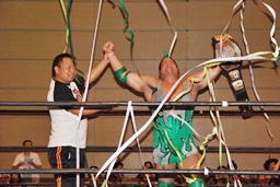 高井が入江の手を上げる。ウィニングテープに包まれる(左写真)。
