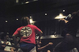 観客の帽子をバルコニーに向けて投げる(左写真)。
