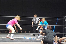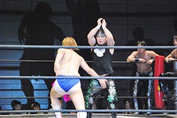 ウラノがコブラツイストに。ディーノ入るがカットはせずに大石の尻を触る(右写真)。ウラノはHARASHIMAにタッチ。