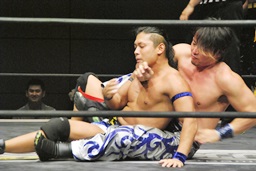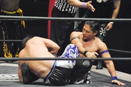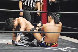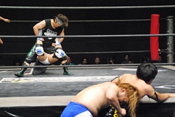 首投げからチキンウィング(右写真)、ウラノにタッチ。ウラノボディスラム、カウント2。HARASHIMAにタッチ。